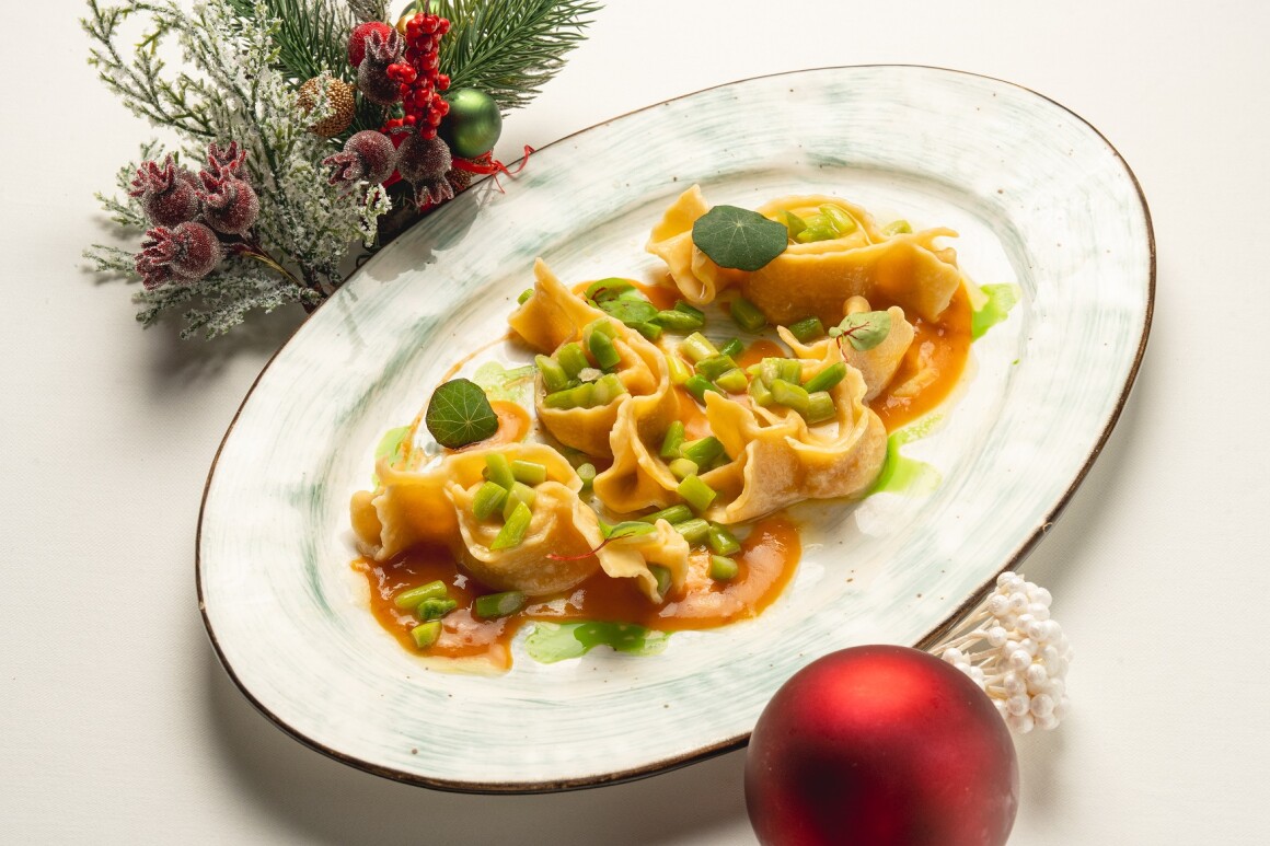 Домашняя паста в виде конфет, с начинкой из форели с луком шалот, соусом бешамель и цедрой апельсина.
