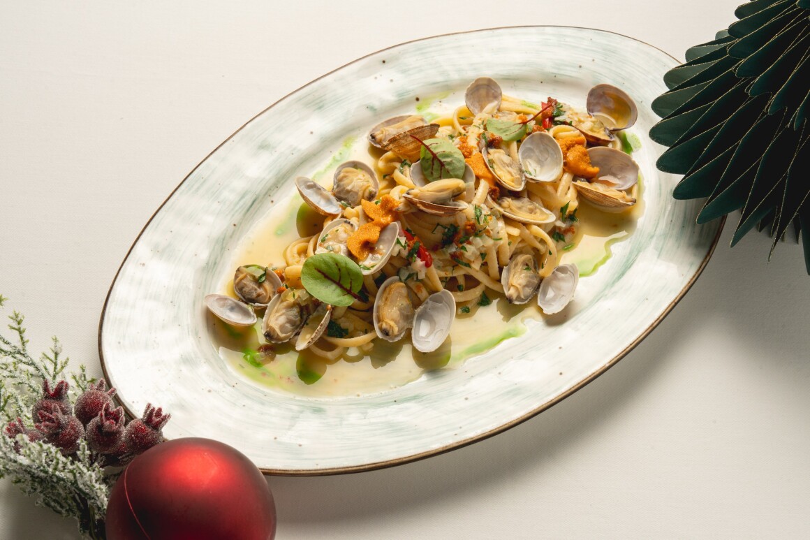 Домашняя паста с вонголе, икрой морского ежа, чесноком, луком шалот, перцем чили, белым вином, сливочным