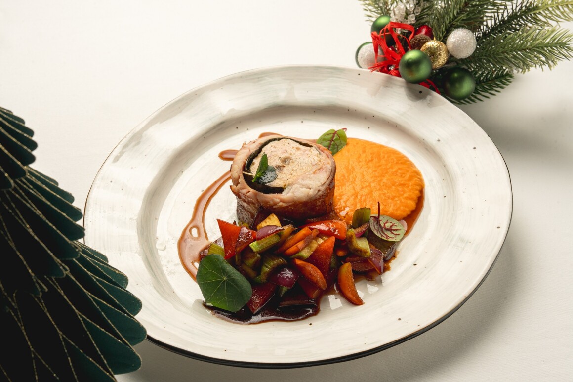 Запеченный рулет из мяса кролика с начинкой из рубленного мяса кролика с яйцом, изюмом, травами и пармезаном,